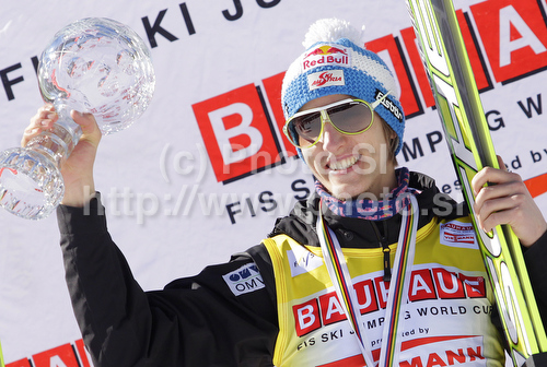 Planica ,Slovenia - 20.03.2011 : Gregor Schlierenzauer of Austria celebrates Ski flying World cup overall medal won in FIS ski jumping World Cup 2010-2011. Final race of FIS ski jumping World cup 2010-2011 was held on Sunday, 20th of March 2011, in Planica, Slovenia. Photo by: Primoz Jeroncic