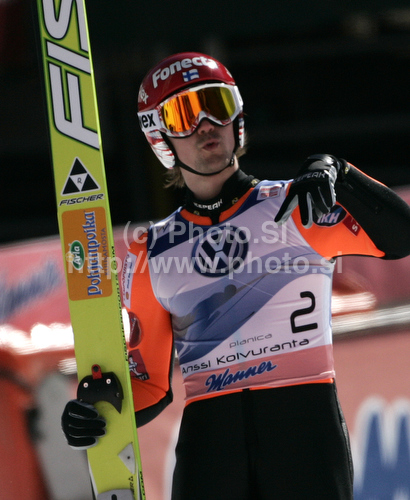 : Anssi Koivuranta of Finland reacts in outrun of first round of day 3 of FIS ski jumping World Cup 2010-2011 finals in Planica, Slovenia. Last individual competition of season on day 3 of FIS ski jumping World cup finals was held on Sunday, 20th of March 2011, in Planica, Slovenia.