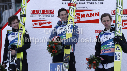 : Winner Robert Kranjec of Slovenia (middle), second placed Simon Ammann of Switzerland (left) and third placed Martin Koch of Austria (right) celebrate their medals won in the Flying hill Individual competition of FIS World cup ski jumping finals in Planica, Slovenia. Flying hill Individual competition FIS World ski jumping finals was held on Friday, 16th of March 2012, in Planica, Slovenia.