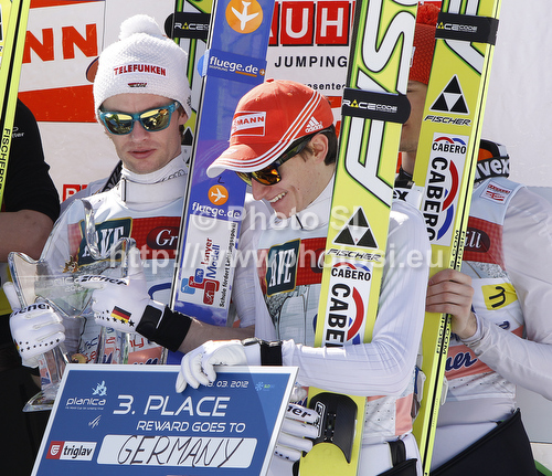 : Third placed team of Germany celebrates their medals won in the Flying hill team competition of FIS World cup ski jumping finals in Planica, Slovenia. Flying hill Team competition FIS World ski jumping finals was held on Saturday, 17th of March 2012, in Planica, Slovenia.