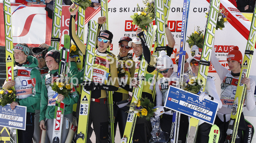 Planica ,Slovenia - 17.03.2012 : Winner team of Austria (middle), second placed team of Norway (left) and third placed team of Germany (right) celebrate their medals won in the Flying hill team competition of FIS World cup ski jumping finals in Planica, Slovenia. Flying hill Team competition FIS World ski jumping finals was held on Saturday, 17th of March 2012, in Planica, Slovenia. Photo by: Mitja Smid Bricelj/PhotoSI