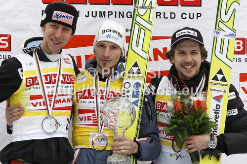 : Winner Robert Kranjec of Slovenia (middle), second placed Martin Koch of Austria (left) and third placed Simon Ammann of Switzerland (right) celebrate their medals won in the overall classification of the Flying hill competition of FIS World cup ski jumping finals in Planica, Slovenia. Flying hill Individual competition FIS World ski jumping finals was held on Sunday, 18th of March 2012, in Planica, Slovenia.