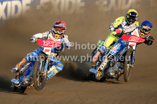 : Emil Sayfutdinov (RUS), Jaroslaw Hampel (POL) and Kenneth Bjerre (DEN) during European GP Speedway Grand Prix 2011 race in Leszno, Poland. European GP Speedway Grand Prix was held on Saturday, 30th of April 2011 in Leszno, Poland.