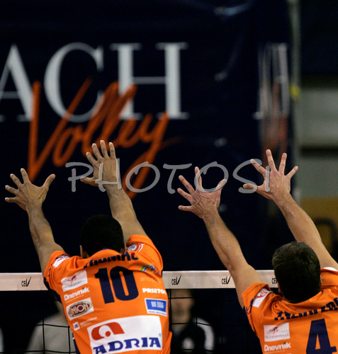 : Delano Thomas of ACH Volley Bled (L) and Brandon Richard Taliaferro of ACH Volley Bled (R) in block during match of Indesit European Champions volleyball league. Match between ACH Volley, Bled, Slovenia, and Dinamo Moscow, Russia was played on 23rd of January 2008 in Tivoli Arena in Ljubljana, Slovenia. Match was by Dinamo Moscow who defeated ACH Volley with 0:3.