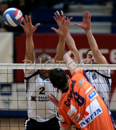 : Mitja Gasparini of ACH Volley Bled (M) spikes over Roberto Carlos Brito da Purificacao of OK Salonit Anhovo (L) and Andrej Kovacic of OK Salonit Anhovo (R) during first match of Slovenian National Championships finals between ACH Volley, Bled, Slovenia and OK Salonit Anhovo, Slovenia. Match was won by ACH Volley Bled who defeated OK Salonit Anhovo with 3:0. Match was played in Radovljica, Slovenia on 12th of April 2008.