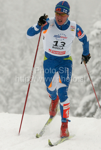 : Lasse Paakkonen of Finland skiing during finals of Men sprint race of Viessmann Cross country skiing FIS World Cup 2009-10. Men sprint race of Viessmann Cross country skiing FIS World Cup were held in Rogla, Slovenia, on 19th of December 2009.