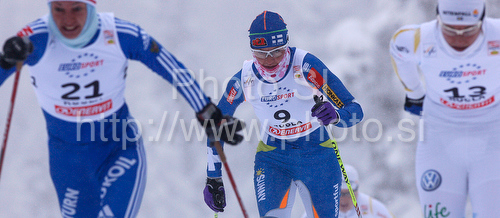 : Olga Rotcheva of Russia (L), Virpi Kuitunen of Finland (M) and Ida Ingemarsdotter of Sweden skiing during finals of Women sprint race of Viessmann Cross country skiing FIS World Cup 2009-10. Women sprint race of Viessmann Cross country skiing FIS World Cup were held in Rogla, Slovenia, on 19th of December 2009.