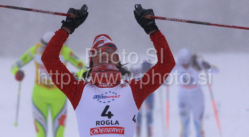 : Winner Marit Bjoergen of Norway celebrates her victory in finals of Women sprint race of Viessmann Cross country skiing FIS World Cup 2009-10. Women sprint race of Viessmann Cross country skiing FIS World Cup were held in Rogla, Slovenia, on 19th of December 2009.