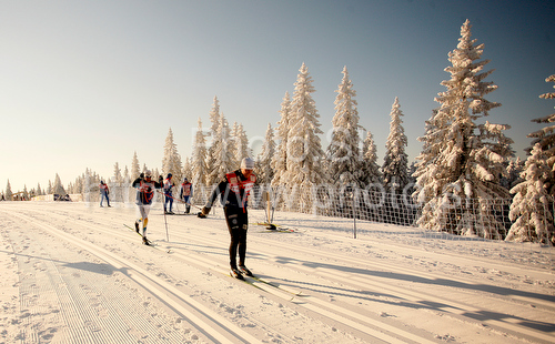 : Skiers warming up before Women 15km classic mass start race of Viessmann Cross country skiing FIS World Cup 2009-10. Women 15km classic mass start race of Viessmann Cross country skiing FIS World Cup were held in Rogla, Slovenia, on 20th of December 2009.
