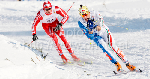 : Pietro Piller Cottrer of Italy (R) and Dario Cologna of Switzerland (L) skiing in Men 30km classic mass start race of Viessmann Cross country skiing FIS World Cup 2009-10. Men 30km classic mass start race of Viessmann Cross country skiing FIS World Cup were held in Rogla, Slovenia, on 20th of December 2009.
