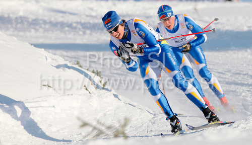 : Martti Jylhae of Finland (L) and Lasse Paakkonen of Finland (R) skiing in Men 30km classic mass start race of Viessmann Cross country skiing FIS World Cup 2009-10. Men 30km classic mass start race of Viessmann Cross country skiing FIS World Cup were held in Rogla, Slovenia, on 20th of December 2009.
