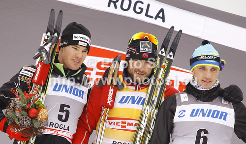 : Winner Petter Northug of Norway (M), second placed Dario Cologna of Switzerland (L) and third placed Alexey Poltoranin of Kazakhstan (right) celebrate their medals won in men 15km classic race of FIS cross country skiing World cup race in Rogla, Slovenia. Men 15km classic race of FIS cross country skiing World cup was held on Rogla, Slovenia, on Saturday, 17th of December 2011.