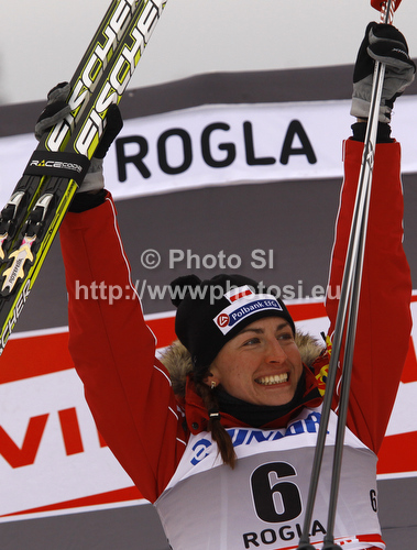 Rogla ,Slovenia - 17.12.2011 : Winner Justyna Kowalczyk of Poland celebrates her medal won in women 10km classic race of FIS cross country skiing World cup race in Rogla, Slovenia. Women 10km classic race of FIS cross country skiing World cup was held on Rogla, Slovenia, on Saturday, 17th of December 2011. Photo by: Primoz Jeroncic