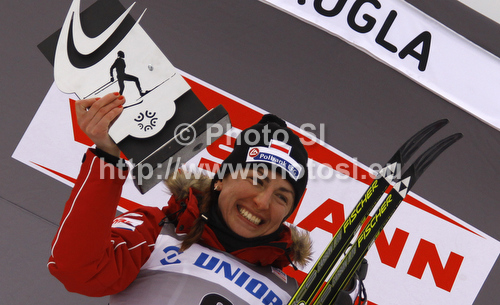 : Winner Justyna Kowalczyk of Poland celebrates her medal won in women 10km classic race of FIS cross country skiing World cup race in Rogla, Slovenia. Women 10km classic race of FIS cross country skiing World cup was held on Rogla, Slovenia, on Saturday, 17th of December 2011.