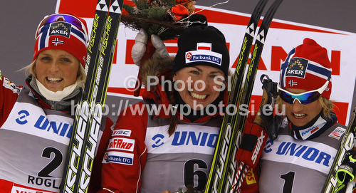 : Winner Justyna Kowalczyk of Poland (M), second placed Therese Johaug of Norway (L) and third placed Vibeke Skofterud of Norway (right) celebrate their medals won in women 10km classic race of FIS cross country skiing World cup race in Rogla, Slovenia. Women 10km classic race of FIS cross country skiing World cup was held on Rogla, Slovenia, on Saturday, 17th of December 2011.