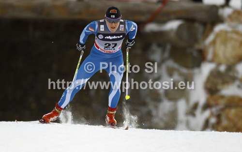 : Aino-Kaisa Saarinen of Finland skiing during qualifications for women sprint free style race of FIS cross country skiing World cup race in Rogla, Slovenia. Women sprint race of FIS cross country skiing World cup was held on Rogla, Slovenia, on Sunday, 18th of December 2011.