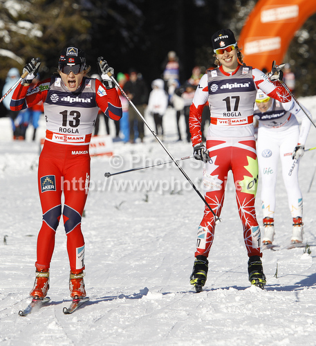 : Winner Maiken Caspersen Falla of Norway crossing finish line in finals of women sprint free style race of FIS cross country skiing World cup race in Rogla, Slovenia. Women sprint race of FIS cross country skiing World cup was held on Rogla, Slovenia, on Sunday, 18th of December 2011.