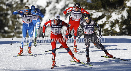 Rogla ,Slovenia - 18.12.2011 : Anssi Pentsinen of Finland (L) and Anders Gloeersen of Norway (2nd from L) skiing during finals of men sprint free style race of FIS cross country skiing World cup race in Rogla, Slovenia. Men sprint race of FIS cross country skiing World cup was held on Rogla, Slovenia, on Sunday, 18th of December 2011. Photo by: Primoz Jeroncic