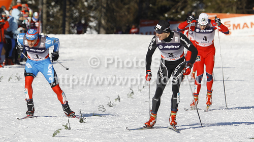 : Winner Dario Cologna of Switzerland (R) and second placed Nikolay Morilov of Russia sprinting in finals of men sprint free style race of FIS cross country skiing World cup race in Rogla, Slovenia. Men sprint race of FIS cross country skiing World cup was held on Rogla, Slovenia, on Sunday, 18th of December 2011.