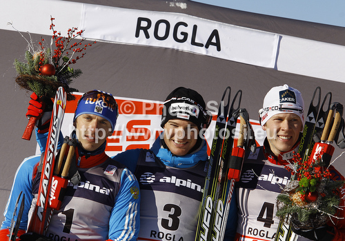 Rogla ,Slovenia - 18.12.2011 : Winner Dario Cologna of Switzerland (M), second placed Nikolay Morilov of Russia (L) and third placed Anders Gloeersen of Norway (R) celebrate their medals won in men sprint free style race of FIS cross country skiing World cup race in Rogla, Slovenia. Men sprint race of FIS cross country skiing World cup was held on Rogla, Slovenia, on Sunday, 18th of December 2011. Photo by: Primoz Jeroncic