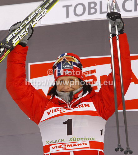 : Winner Marit Bjoergen of Norway celebrates her medal won in women sprint free style race of Tour de Ski race of FIS cross country skiing World cup race in Toblach-Dobbiaco, Italy. Women sprint race, stage 6 of Tour de Ski and FIS cross country skiing World cup was held on Toblach-Dobbiaco, Italy, on Wednesday, 4th of January 2012.